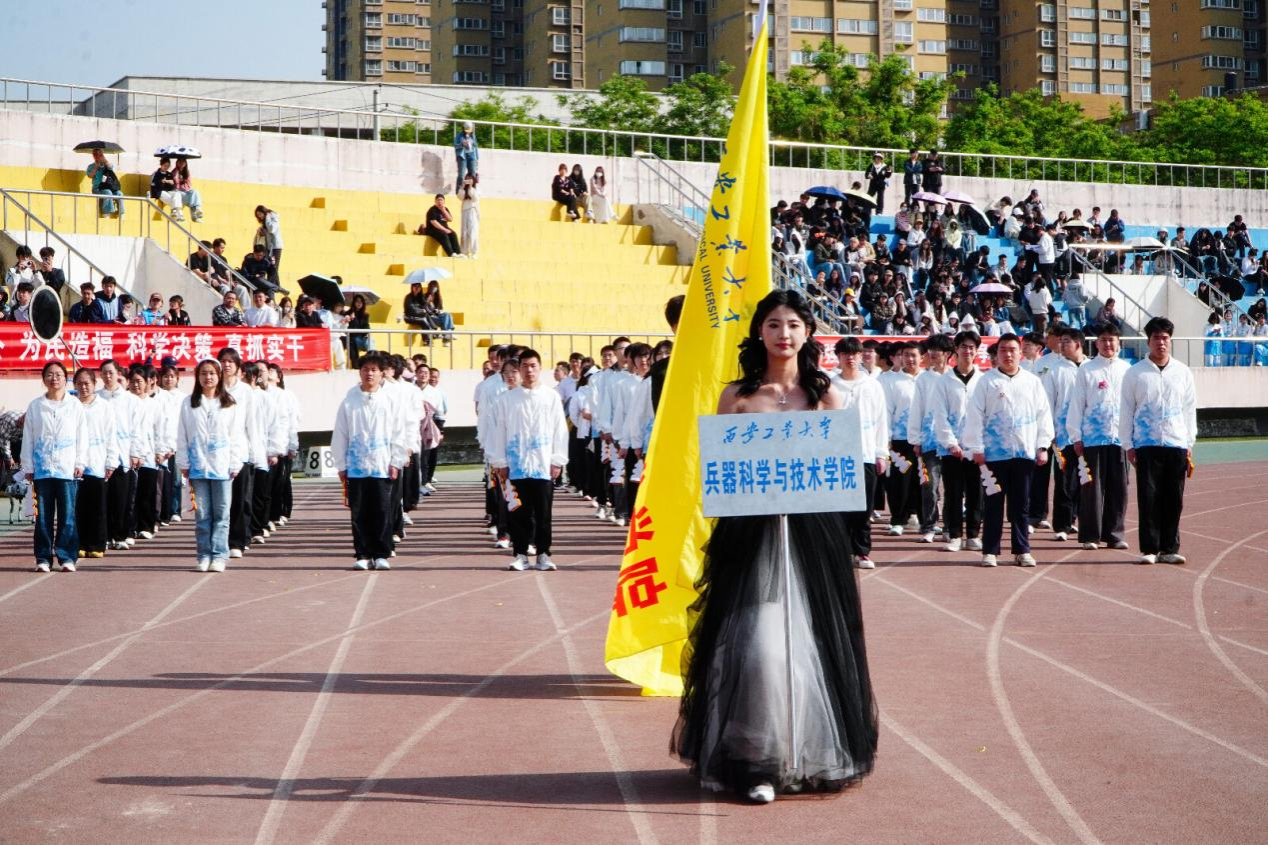 方阵气势如虹。学子们步伐铿锵、精神抖擞,以严整的队列和饱满的热情亮相赛场。方阵既彰显出兵器学子的严谨朝气,更传承了西安工业大学“忠诚进取,精工博艺”的兵工精神,用青春誓言诠释矢志国防、为国担当的信念。